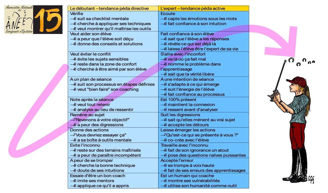 | Veut aider son élève → Il a peur que l’élève soit déçu → Il donne des conseils et solutions | Fait confiance à son élève → Il sait que l’élève a les réponses → Il révèle ce qui est déjà là → Il laisse l’élève être l'expert de sa vie |